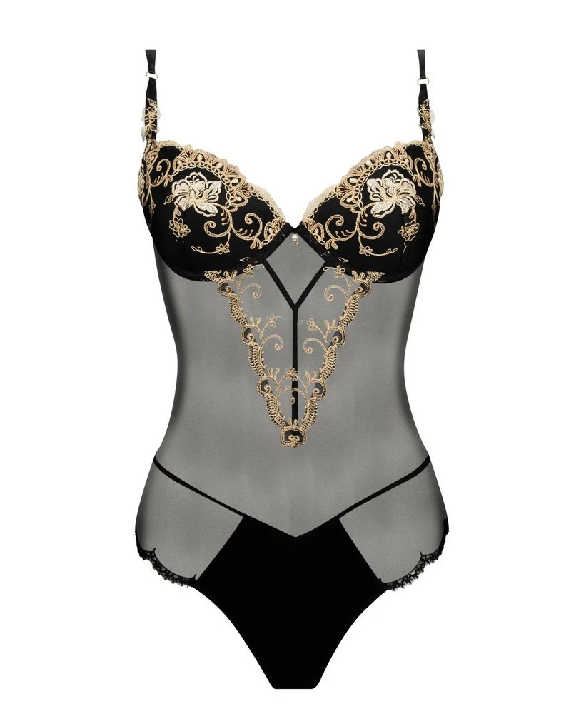 Le body Déesse en Glam de la marque Lise Charmel propose une tenue glamour en soie avec de précieux détails de dentelle.