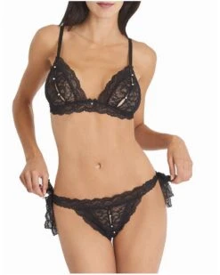 L’ensemble perles Aubade de la collection Boîte à désir propose un soutien-gorge forme triangle, avec des perles sur le devant et un slip à nouer avec lui aussi des perles devant. Ces quelques perles apportent une touche de raffinement et donnent à cet ensemble un look sexy qui fera succomber votre partenaire.