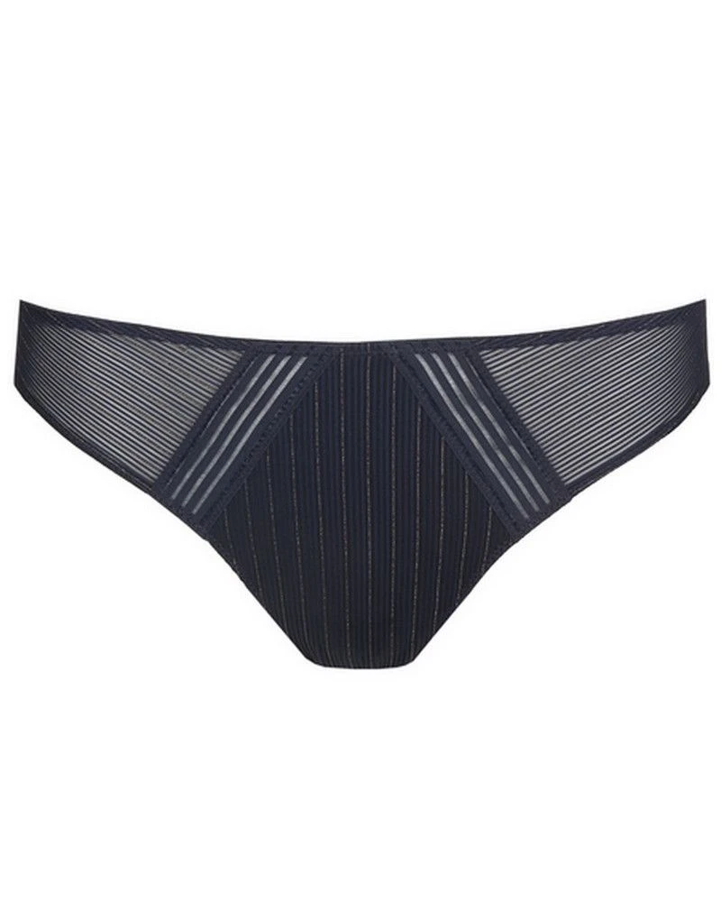 Slip brésilien élégant affichant un jeu de lignes frivoles et des empiècements transparents séduisants sur les hanches.