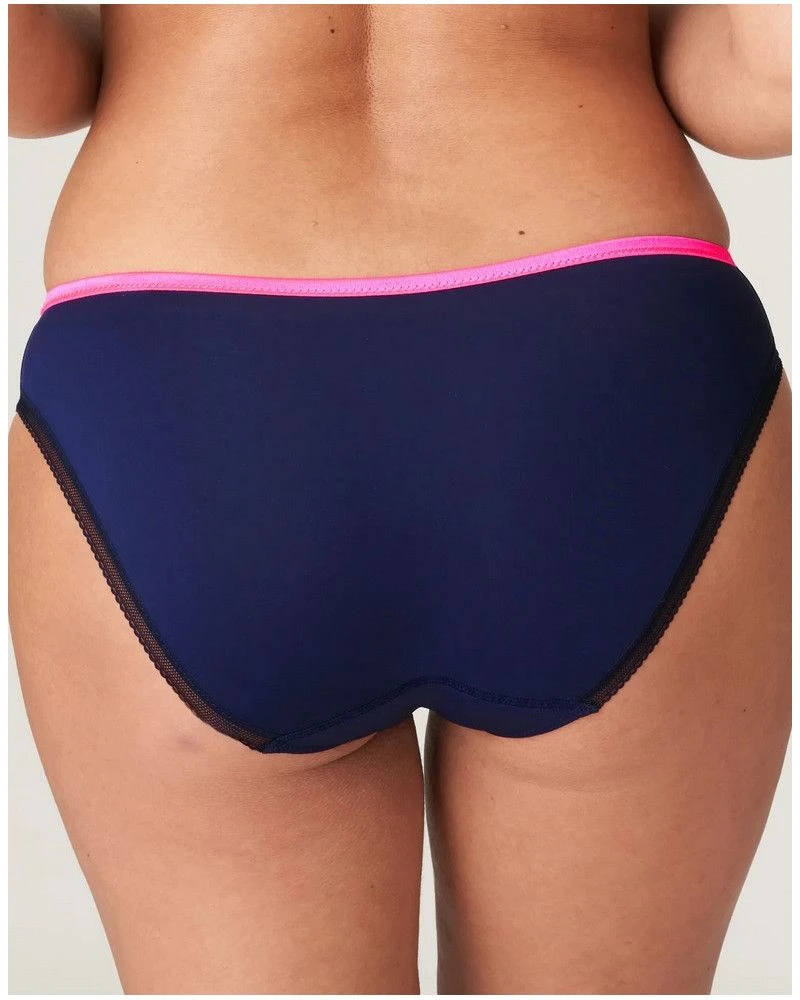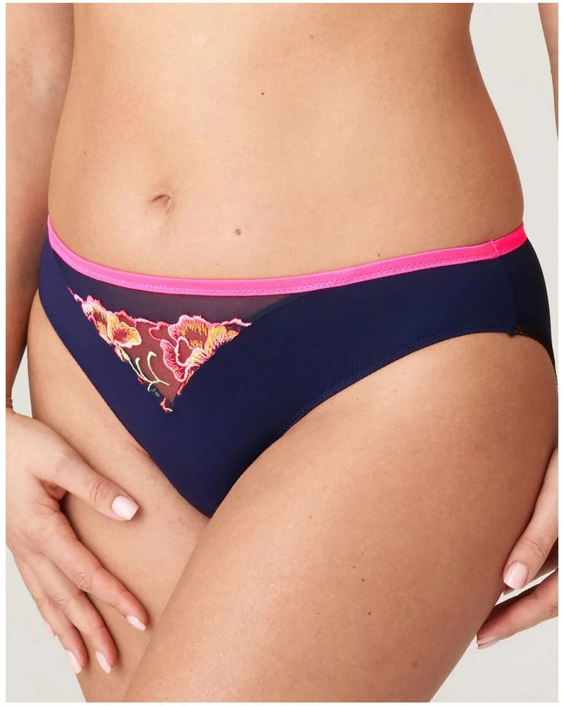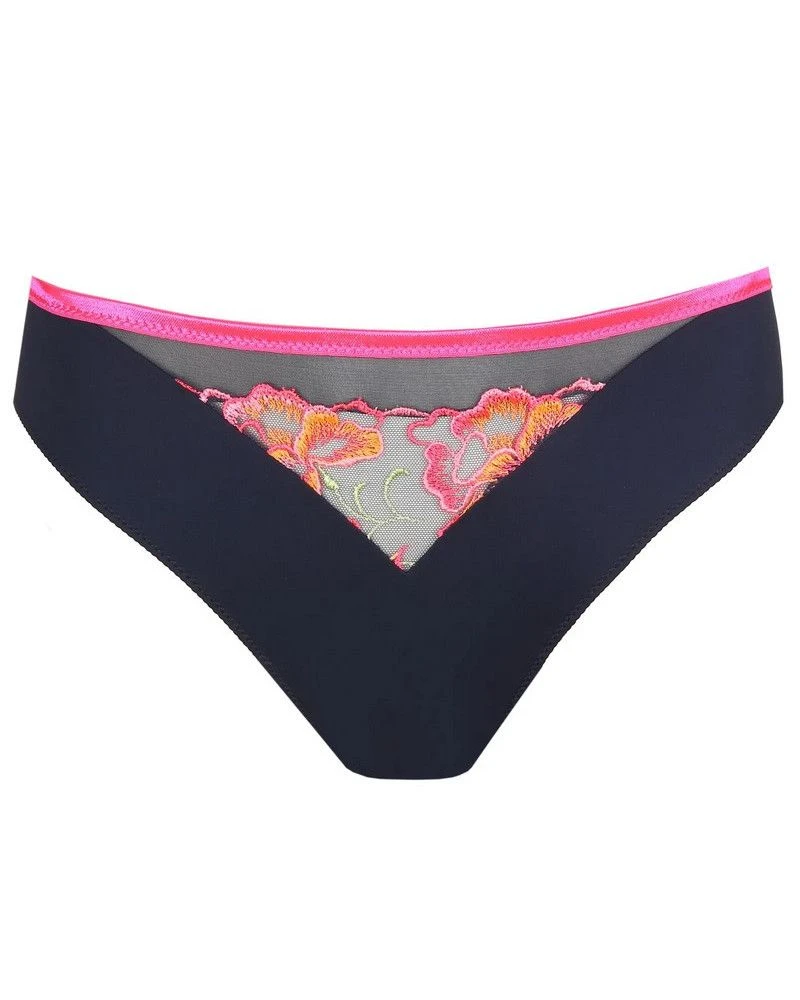 Slip brésilien séduisant en tulle affichant des broderies colorées et un tissu opaque. Un empiècement transparent sexy orne le dos et un élastique fin borde les jambes. Les couleurs pétillantes de Velvet Blue soulignent votre silhouette d’un bouquet de broderies rose fluo sur une base bleu foncé.
