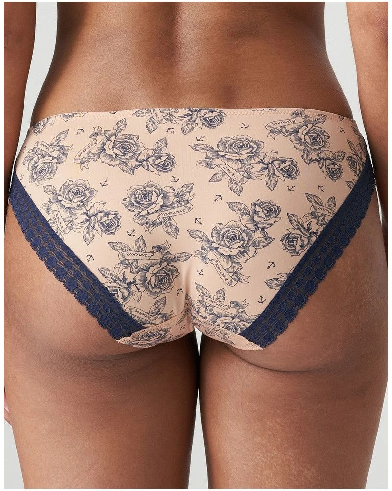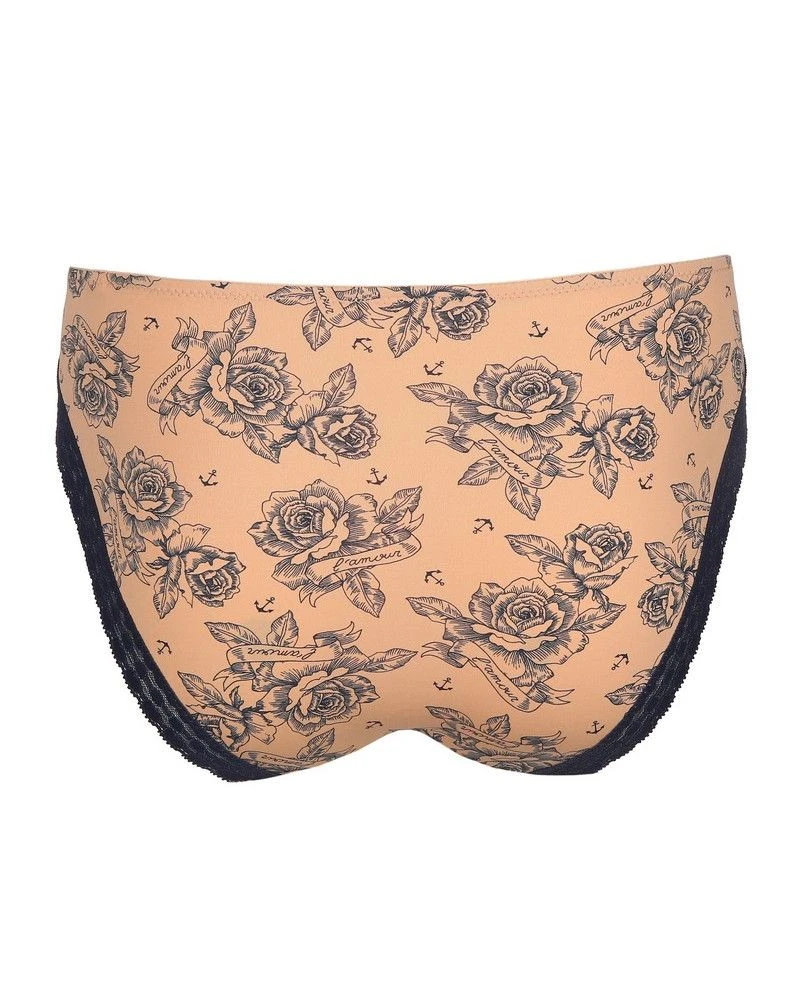 Slip brésilien lisse, réalisé en tissu doux à motif tatouage. Une délicate dentelle à la taille et aux jambes évite les démarcations sous vos vêtements. Les lignes échancrées du slip brésilien élancent la silhouette.