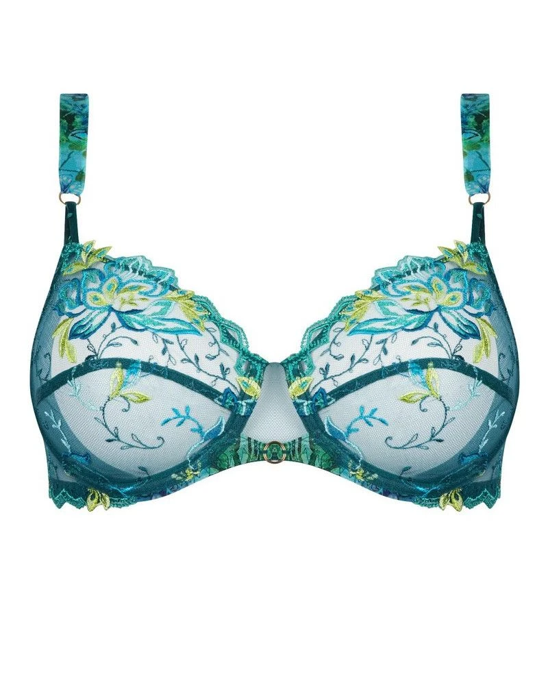 Grâce Aquatique est une nouvelle collection proposée par la marque Lise Charmel. Une ligne luxueuse avec sa broderie colorée qui attire le regard. Elle retrace le voyage de nos rêves à travers des coupes structurées associant broderie et imprimé placé.